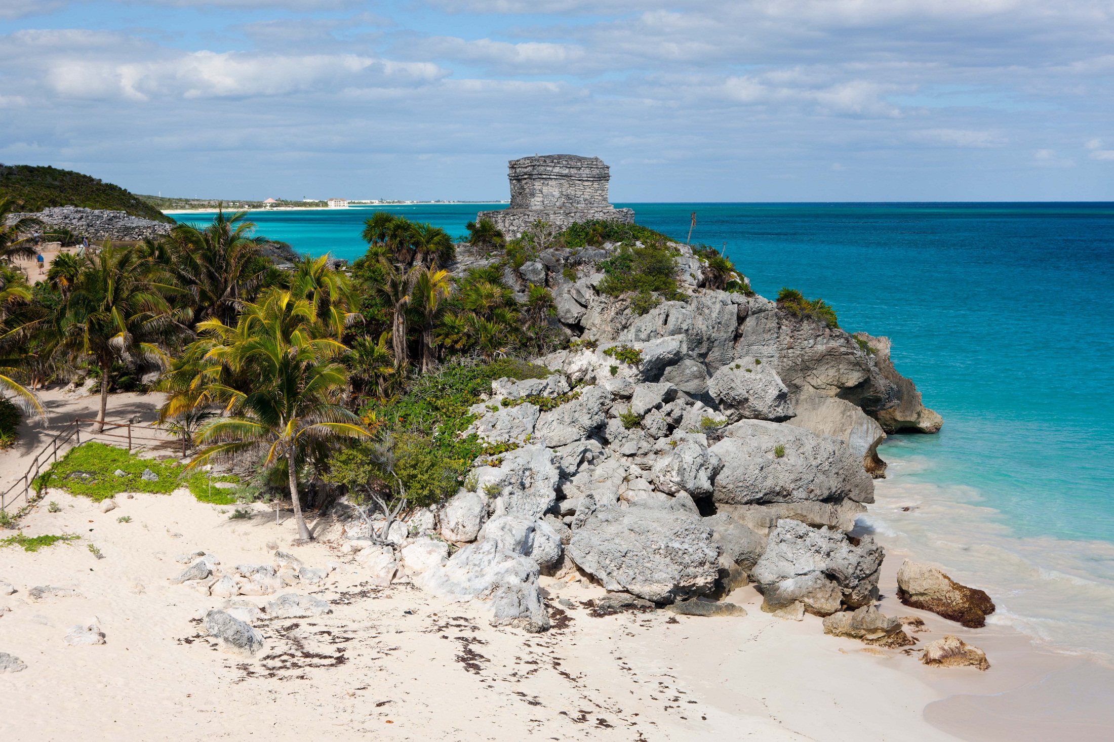 Ne îndreptăm spre situl arheologic Tulum, unul dintre cele mai bine conservate situri mayașe, poziționat spectaculos pe coastă, cu plaje cu nisip alb, palmieri și ape turcoaz.